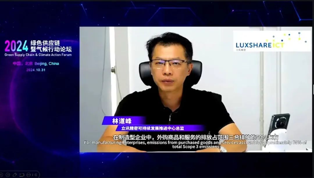 在綠色供應(yīng)鏈暨氣候行動論壇活動期間,立訊精密可持續(xù)發(fā)展推進中心總監(jiān)林道鋒分享了立訊精密在綠色供應(yīng)鏈管理方面的良好實踐,助力各行各業(yè)企業(yè)落實供應(yīng)鏈環(huán)境和氣候承諾。