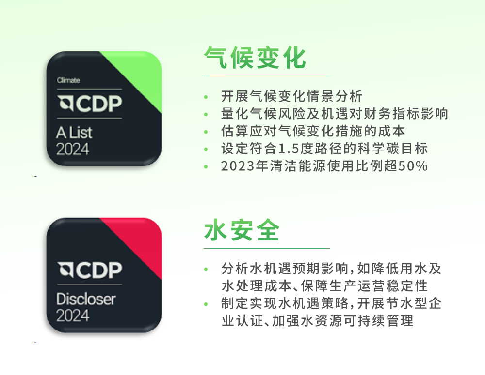 全球環(huán)境信息研究中心(CDP)評(píng)級(jí),被廣泛視為衡量企業(yè)環(huán)境透明度和可持續(xù)發(fā)展行動(dòng)的重要基準(zhǔn),覆蓋全球超22000家公司。近日,CDP公布2024年評(píng)級(jí)結(jié)果,立訊精密評(píng)級(jí)連續(xù)四年穩(wěn)步提升,在氣候變化領(lǐng)域獲評(píng)「A」級(jí)、水安全領(lǐng)域獲評(píng)「A-」級(jí),雙雙位列全球領(lǐng)導(dǎo)力等級(jí),這一突破高度認(rèn)可了立訊精密在氣候變化的應(yīng)對(duì)和水資源的可持續(xù)利用方面的努力和成果。