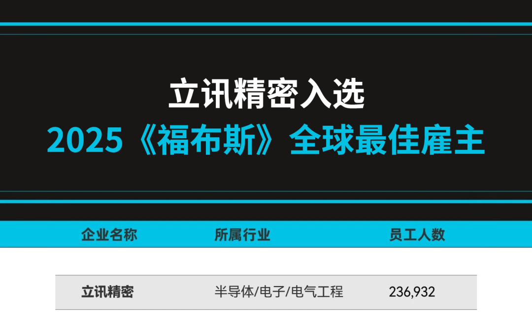 近日,全球權(quán)威財(cái)經(jīng)媒體《福布斯》正式發(fā)布 2025 年全球最佳雇主榜單,立訊精密成功入選。