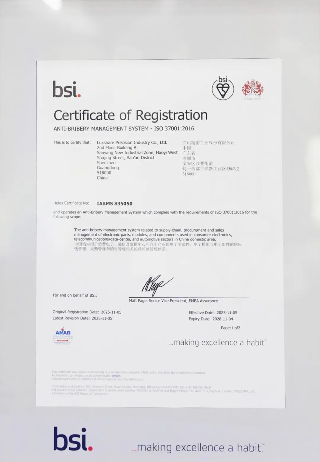 12月9日,全球權(quán)威標(biāo)準(zhǔn)機(jī)構(gòu)英國標(biāo)準(zhǔn)協(xié)會(BSI)正式向立訊精密頒發(fā)了ISO37001:2016反賄賂管理體系認(rèn)證證書。這標(biāo)志著立訊精密深化廉潔建設(shè)、推進(jìn)可持續(xù)發(fā)展征程,邁出了堅實且關(guān)鍵的一步。